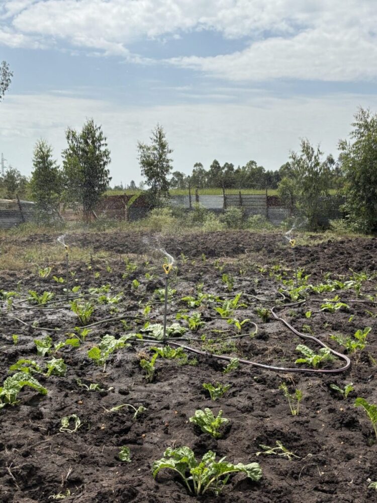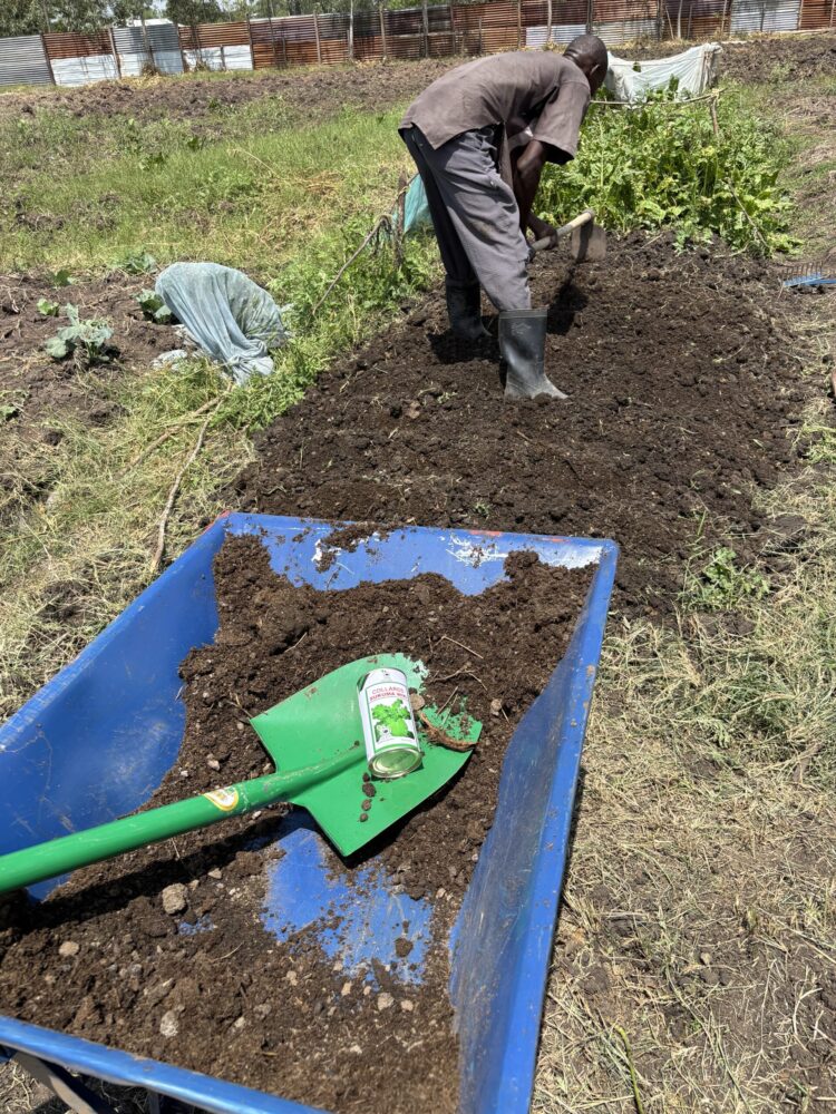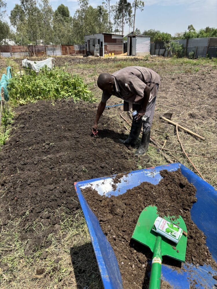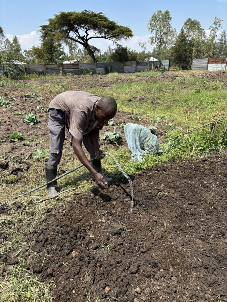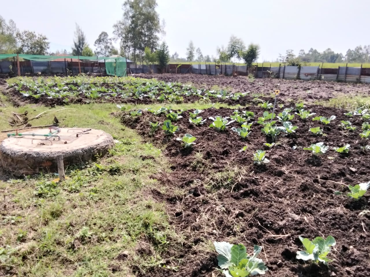 Wir betreiben seit Sommer 2024 eine eigene Farm am Stadtrand von Kisumu, mit 3.500m² Ackerland. Man sieht am Bild unten den Wasserturm, der mittels Photovoltaik vom Brunnen gespeist wird. Ganz hinten in der Mitte sieht man das Haus für den Wächter des Feldes, gleichzeitig Geräteschuppen und Zwischenlager für die Ernte. Der Anbau ist rein biologisch, ohne Kunstdünger