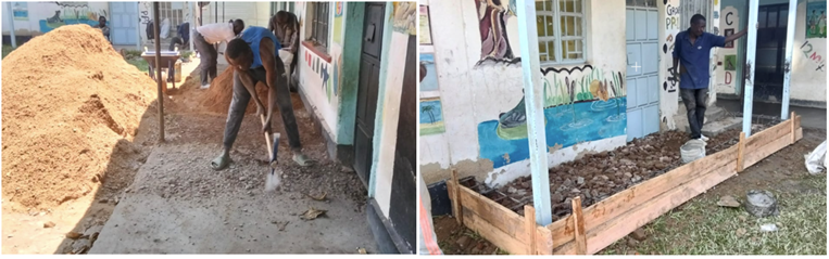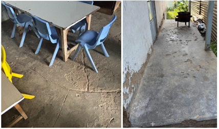 Bröckelnde Klassenböden und Kochnischen BodenSanierung des Verandabodens und Erweiterung der Küche