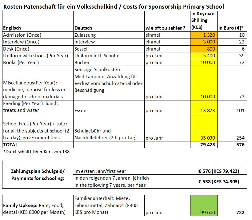 Falls du eine Patenschaft übernehmen möchtest, wird dir eines der bedürftigsten Kinder zugewiesen. Du erfährst dessen Namen und bekommst auf Wunsch auch ein Foto. Deine Spenden für dieses Kind werden zweckgewidmet nach Kisumu überwiesen. Unser Team vor Ort achtet darauf, dass von deinem Beitrag das Schulgeld und die Schulausgaben für dieses Kind bezahlt werden.